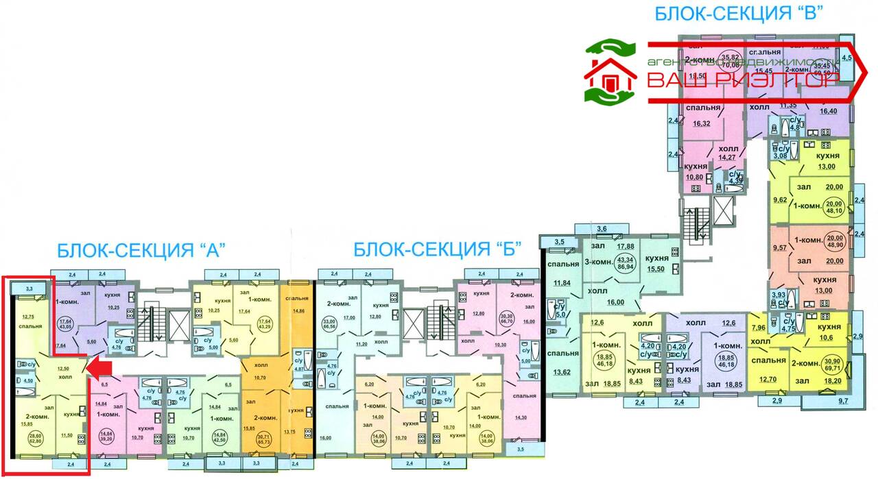 Полулоджия из зала (16м) – во двор и балкон из кухни (12м) на сторону «Магнита».