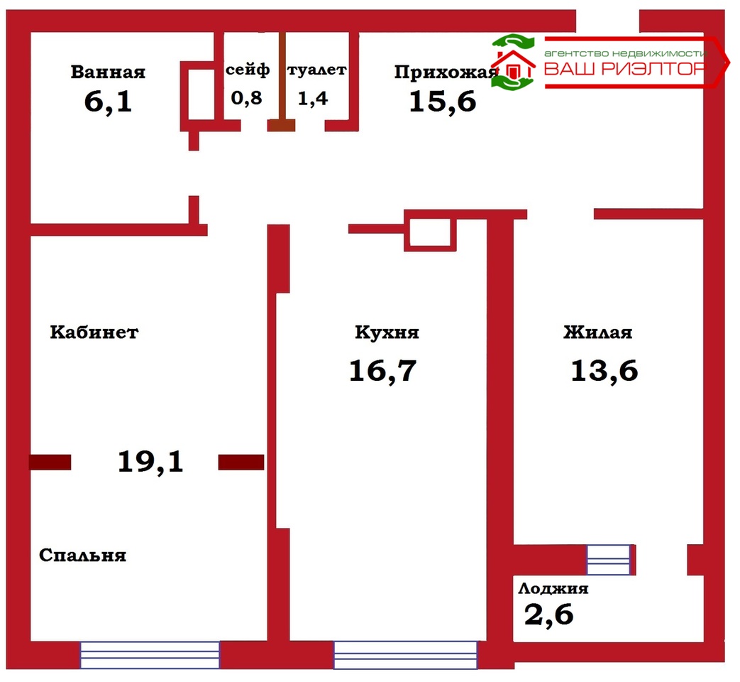 Санузел раздельный (6,1 + 2,2) :